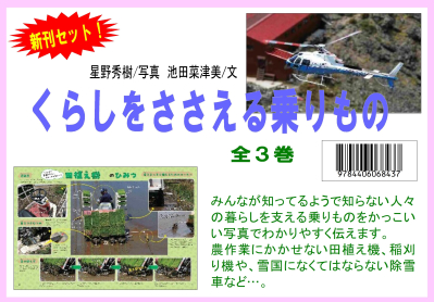 登山者に大人気、槍ヶ岳の山小屋に必要な荷物を運び上げるヘリコプターは力持ち。田植え機、稲刈り機だけじゃない? たくさんの乗りものが活躍している米づくり。そして雪国の生活の足を守る除雪車。みんなが知ってるようで知らない人々の暮らしを支える乗りものをかっこいい写真でわかりやすく伝えます。